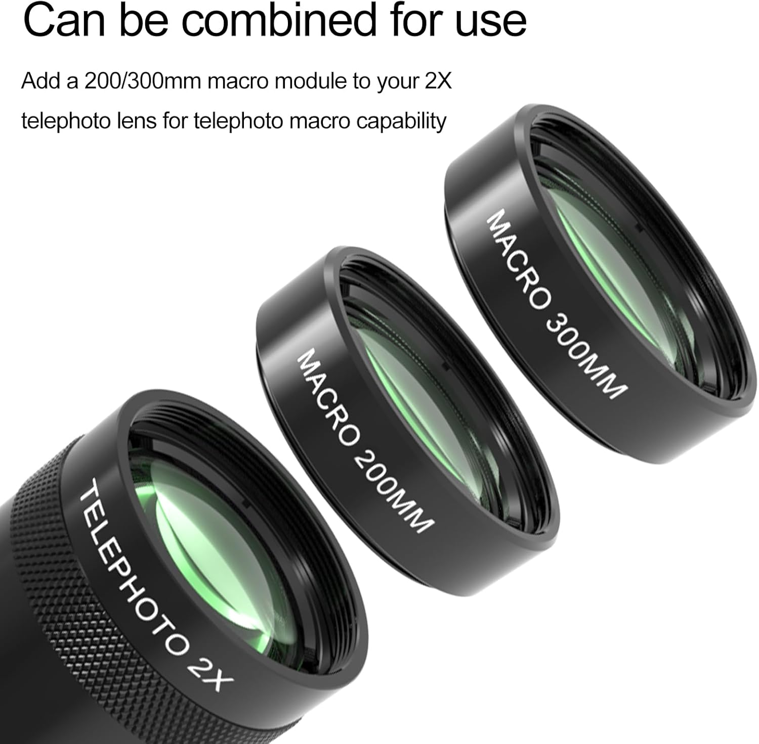 【Using Macro】If you want to use macro, please install the macro lens on 2x telephoto lens, 200mm and 300mm macro lenses can be used separately or together. Note: 200mm focusing distance 20cm, 300mm focusing distance 30cm, 500mm focusing distance 11cm.