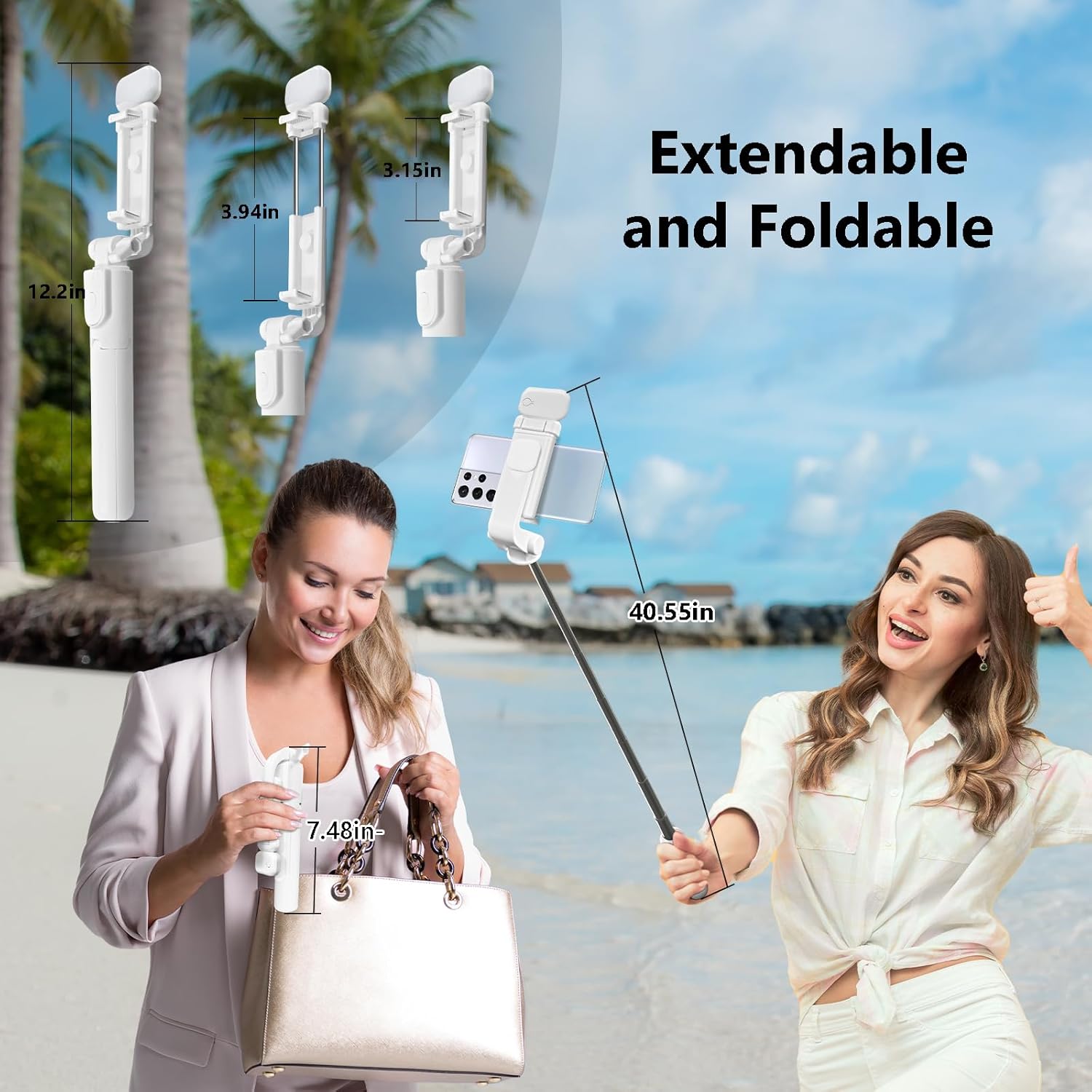 [Tumbler that can be carried around]–The selfie stick adopts a hidden retractable design, which is very light and small when folded, so it is convenient to carry around. Pull out the pole to extend a certain distance, from 7.5 inches to 40 inches, providing you with different field of view shooting effects. It’s not just a selfie stick, it also converts into a phone stand. The handle pulls away from the bottom to create a tripod that you can place on flat ground for extra stability.